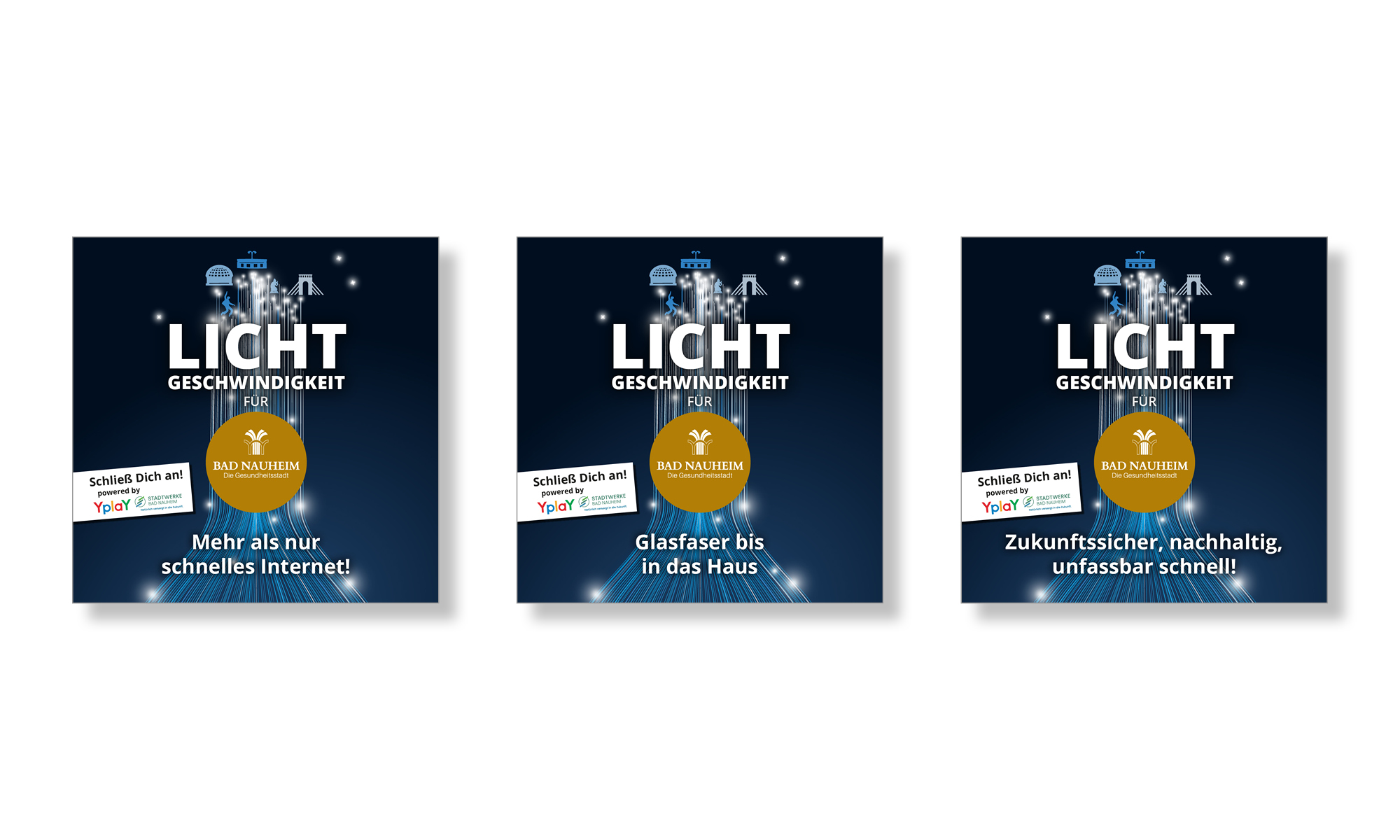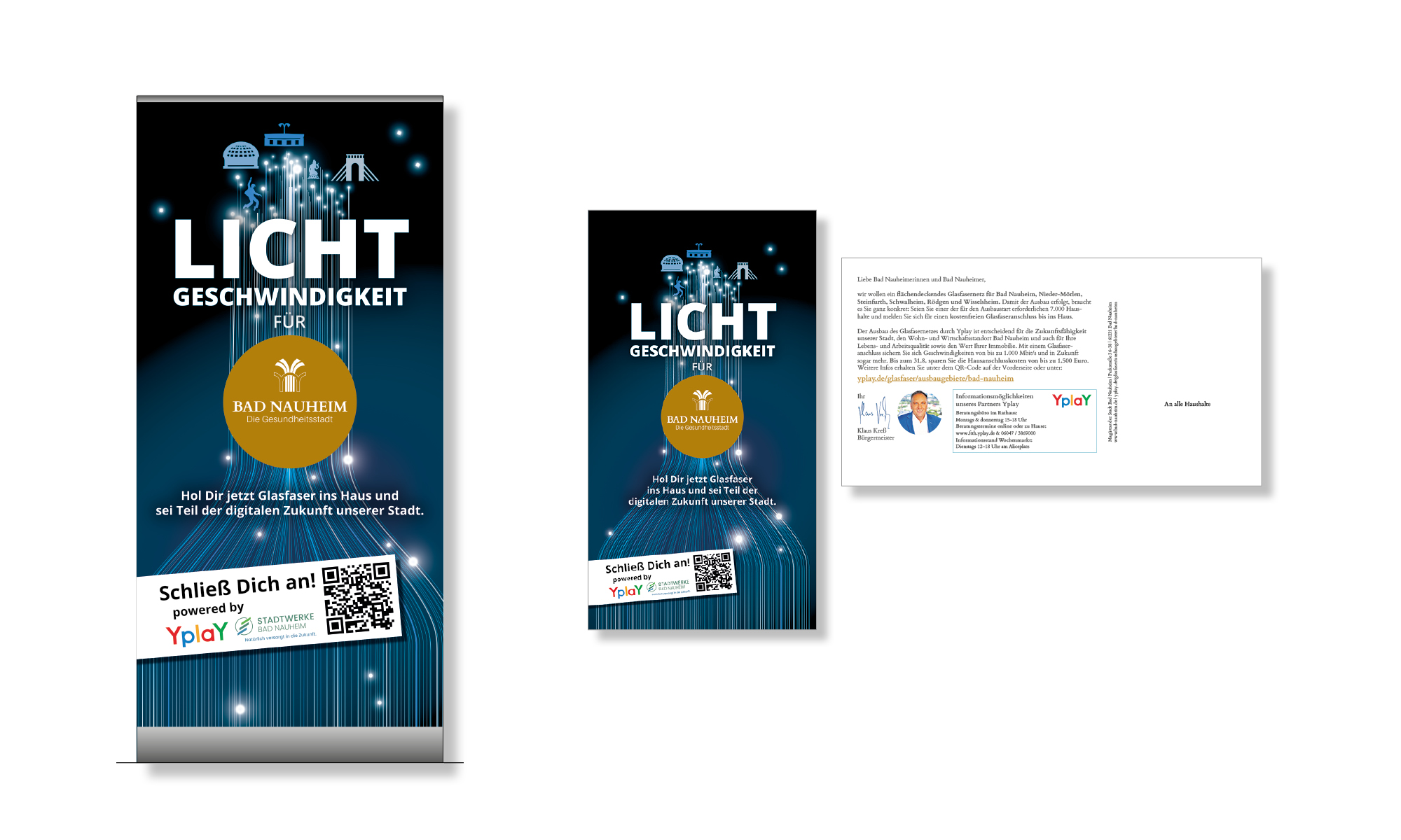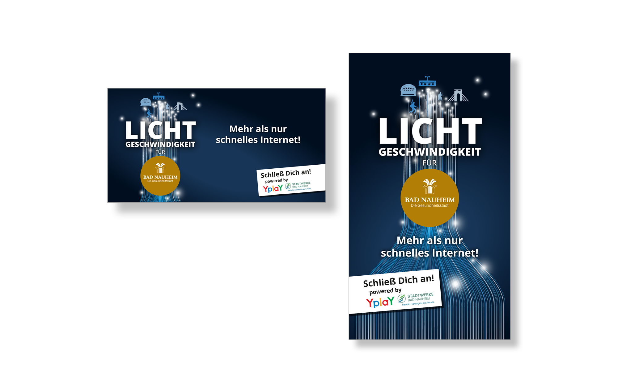 Für den Bad Nauheimer Breitbandanschluss wurde kurzfristig eine Kampagne entwickelt, um die Bürger:innen über die Vorteile des modernen Internetanschlusses aufzuklären. Die Firma yplay setzt in Zusammenarbeit mit den Stadtwerken Bad Nauheim die Erschließung des Glasfasernetzes um.
